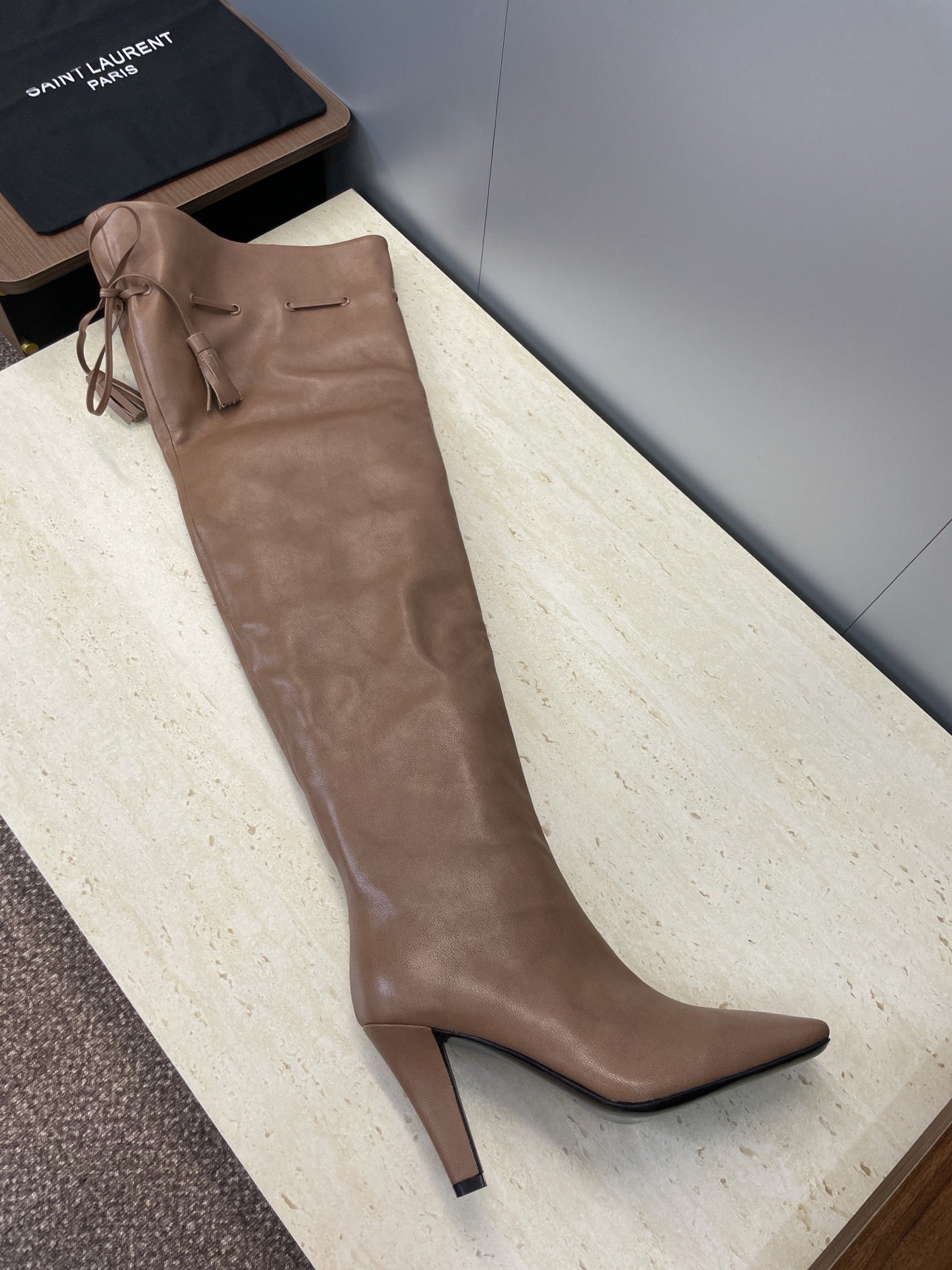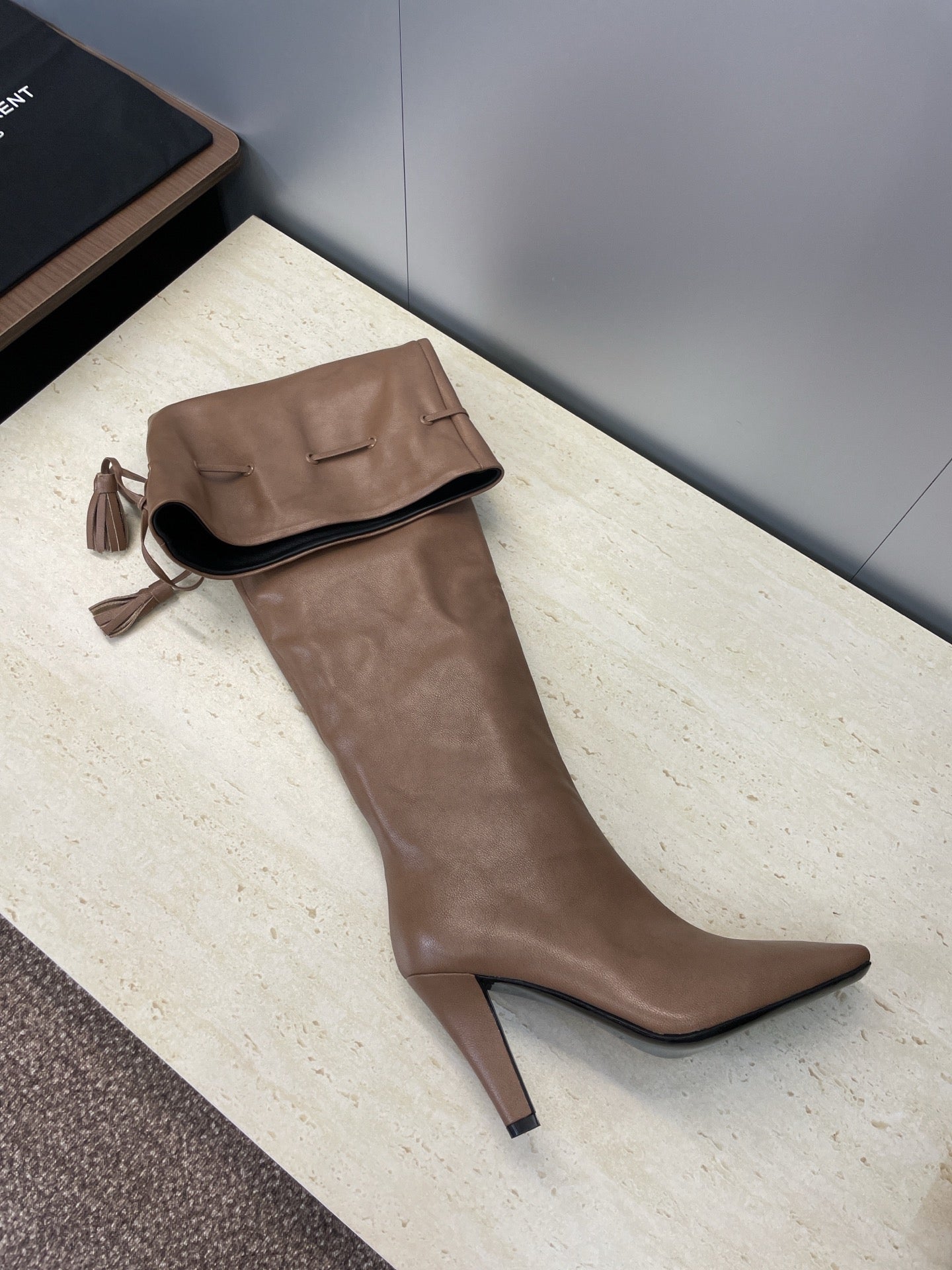 YSL 25S HIGH‑HEEL FRINGED MARTIN BOOTS 90 MM IN CHESTNUT BROWN LAMBSKIN