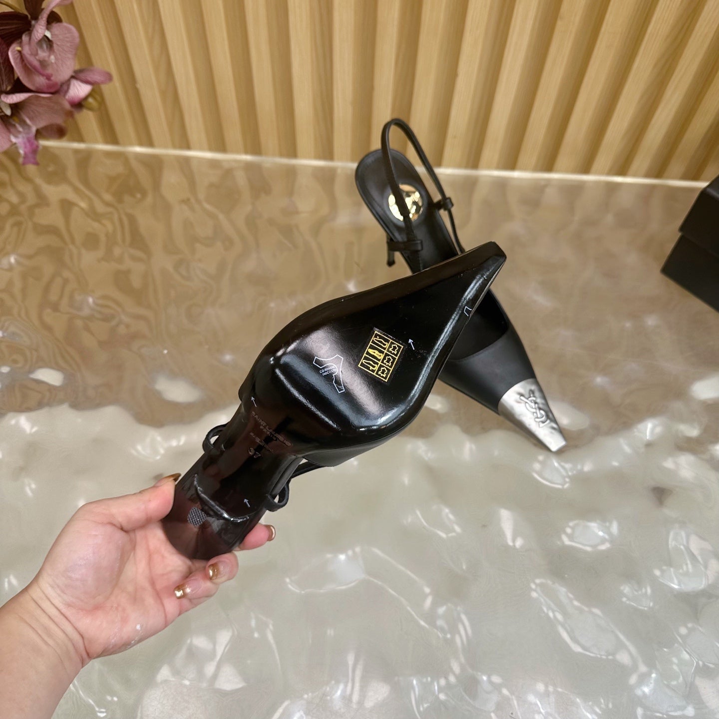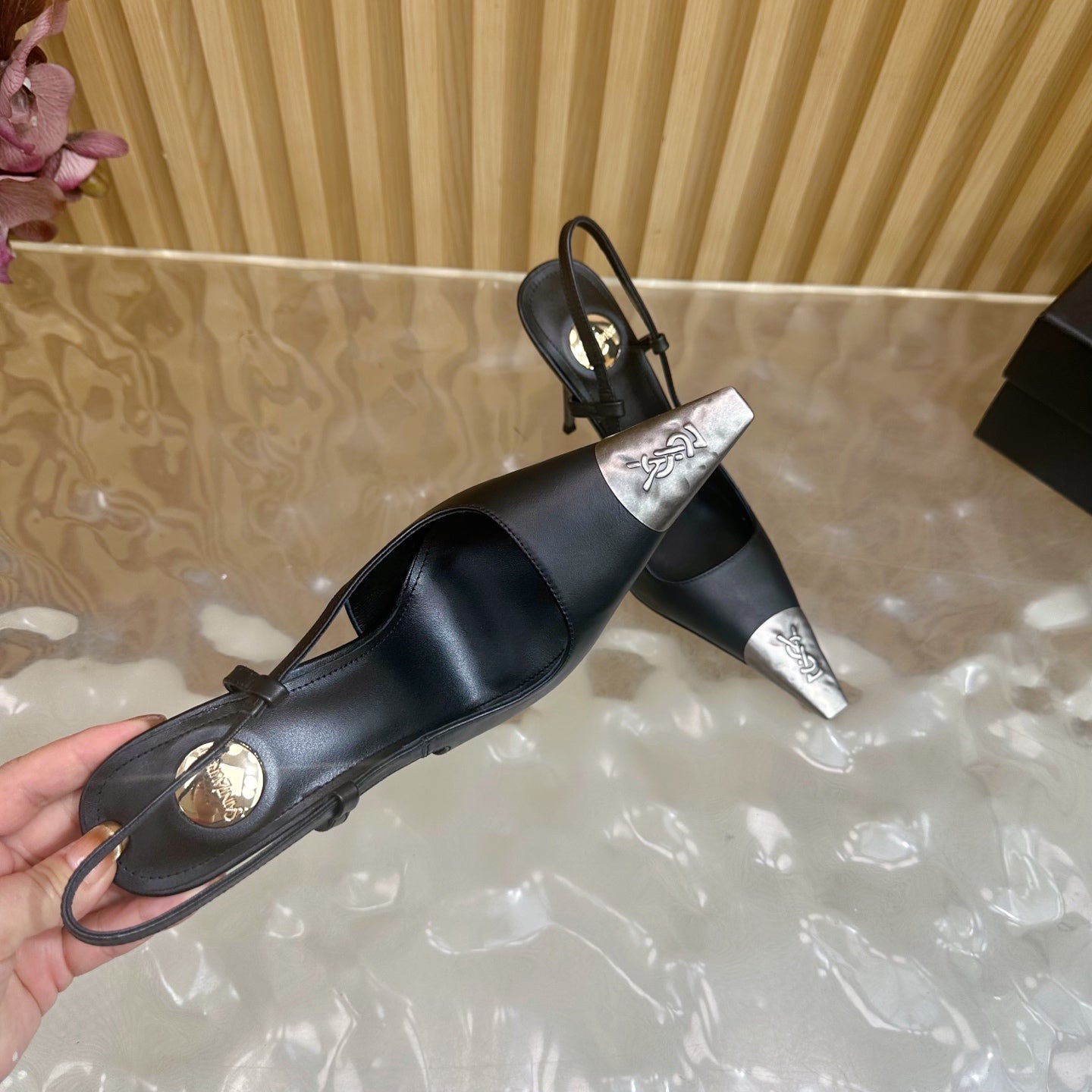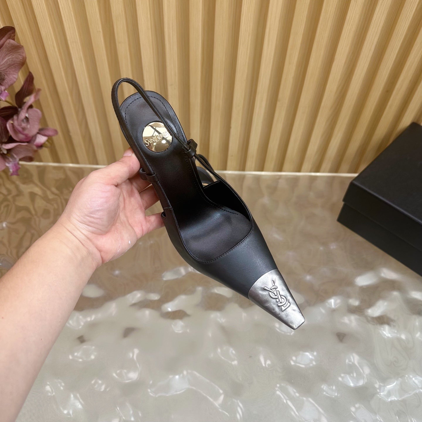 YSL 25S HIGH-HEEL SLINGBACKS 85 MM IN BLACK LAMBSKIN AND SILVER HARDWARE
